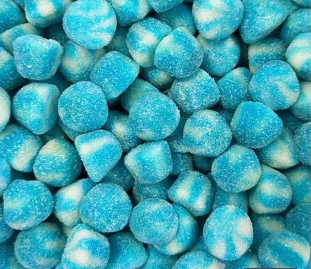 Ingrédients: Sirop de glucose, sucre, eau, amidon acétylé, gélatine de boeuf certifié, humectant (E420), acidulants (E330, E270), correcteur d'acidité (E325), amidon, agents d'enrobage (E901, E903), arômes, colorants: E133.
