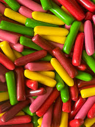 Ingrédients :Sucre, sirop de glucose, graisse de palme, 5% jus de fruits à base de concentrés (pomme, pêche, citron, fraise, framboise), gélatine bovine, stabilisant [gomme arabique], amidon modifié, acidifiant [acide lactique, acide lactique, acide citrique], arôme, émulsifiant [lécithines], colorants [E120, E100, E133, E153], dextrose, agents d'enrobage [E903, E904, E901]