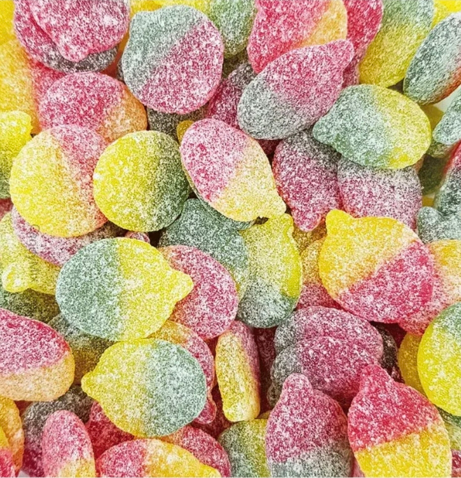 Ingrédients : Sucre, sirop de glucose, amidon de BLÉ, eau, amidon de maïs modifié, acidifiants [E270, E296, E330, E350], amidon de pomme de terre modifié, correcteur d'acidité [E500], concentré de spiruline et de carthame, concentré de jus de carotte noire, colorant [E100].